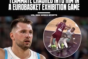 体育资讯08月17日讯 欧锦赛男篮热身赛,斯洛文尼亚88-100不敌拉脱维亚,东契奇被队友撞翻在地。