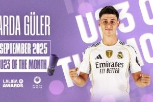 体育资讯9月30日讯 官方消息,居勒尔荣获9月份西甲最佳U23球员奖,