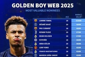 体育资讯10月29日讯 金童奖在本月已经公布了候选名单,《转会市场》也统计了今年候选者的身价情况,亚马尔无悬念居首。